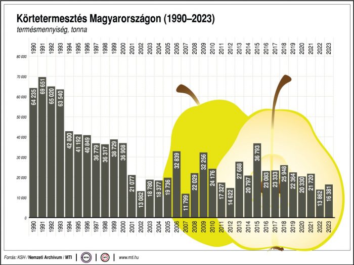 Megjegyzik: az utóbbi években a körte termőterülete és termésmennyisége is folyamatosan csökkent. Az országban 1886 hektáron termelnek körtét, köztük számos tájfajtát. Tavaly is gyenge termést takarítottak be, a NAK és a FruitVeB körképe szerint a kedvezőtlen időjárás miatt idén még a tavalyinál is kevesebb termés várható.