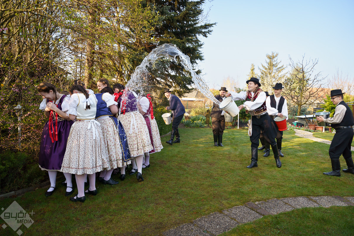 Korán reggel népviseletben várták a ménfőcsanaki Marcal Tánc -és Népművészeti Egyesület lányai a fiúkat. A legények is megfelelő öltözetben, öblös vödrökkel érkeztek, amiket kútvízzel töltöttek meg. A lányokat kiküldték az udvarra, majd a különleges locsolóvers után jó nagy adag vizet kaptak a nyakukba, így már biztosan nem hervadnak el.