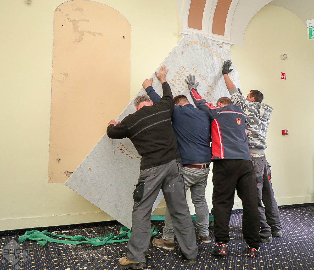 Lekerült a városházi folyosó faláról és a múzeumba szállítják azt a kőtáblát, amelyen korábbi polgármesterek és tanácselnökök nevei láthatók.