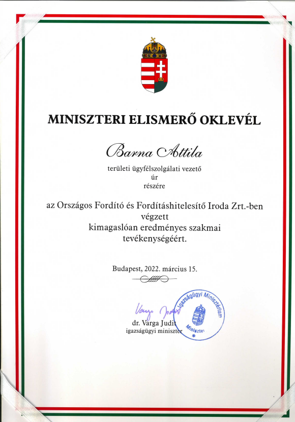 Az Országos Fordító és Fordításhitelesítő Iroda Zrt.-ben (OFFI) végzett kimagaslóan eredményes szakmai tevékenységéért díjazták Barna Attilát. A szervezet területi ügyfélszolgálati vezetője elismerő oklevelet vehetett át Varga Judit igazságügyi minisztertől.