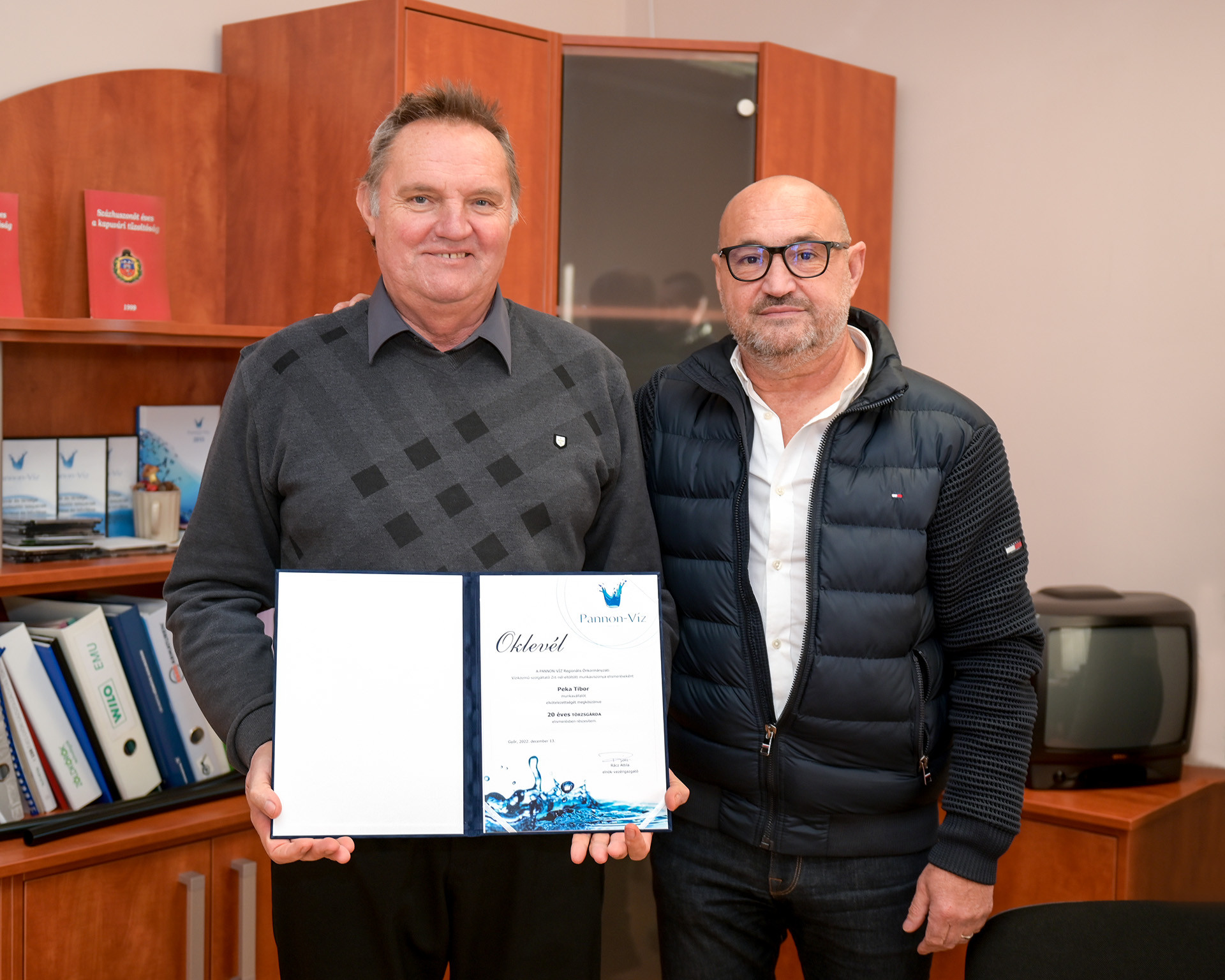 Jubileumi oklevelek átadásával mondott köszönetet a Pannon-Víz Zrt. nevében Rácz Attila elnök-vezérigazgató társaságunk azon elkötelezett dolgozóinak, akik munkájukkal már több évtizede segítik a térségi víziközmű-szolgáltatás működését.