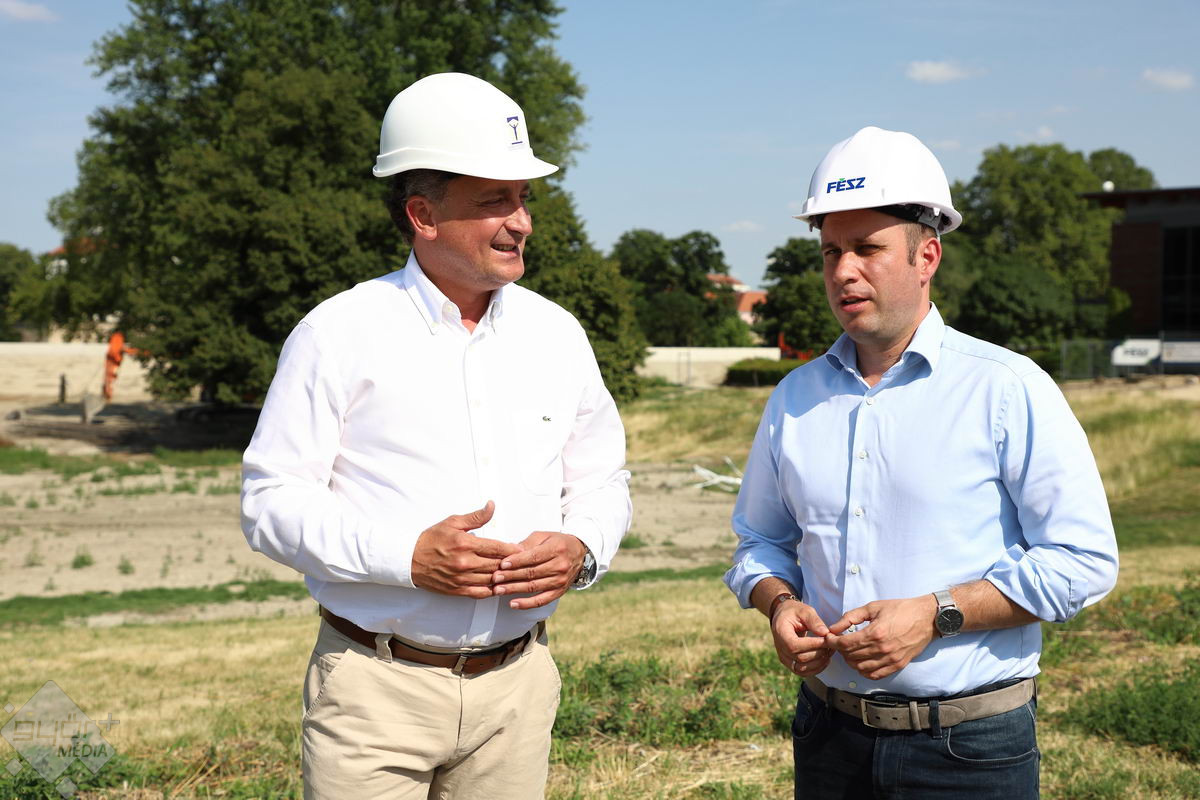 Simon Róbert Balázs országgyűlési képviselő Dömötör Csabával, a Miniszterelnöki Kabinetiroda államtitkárával tartott közös sajtótájékoztatót péntek az épülő Győri Vízi Élményparknál.