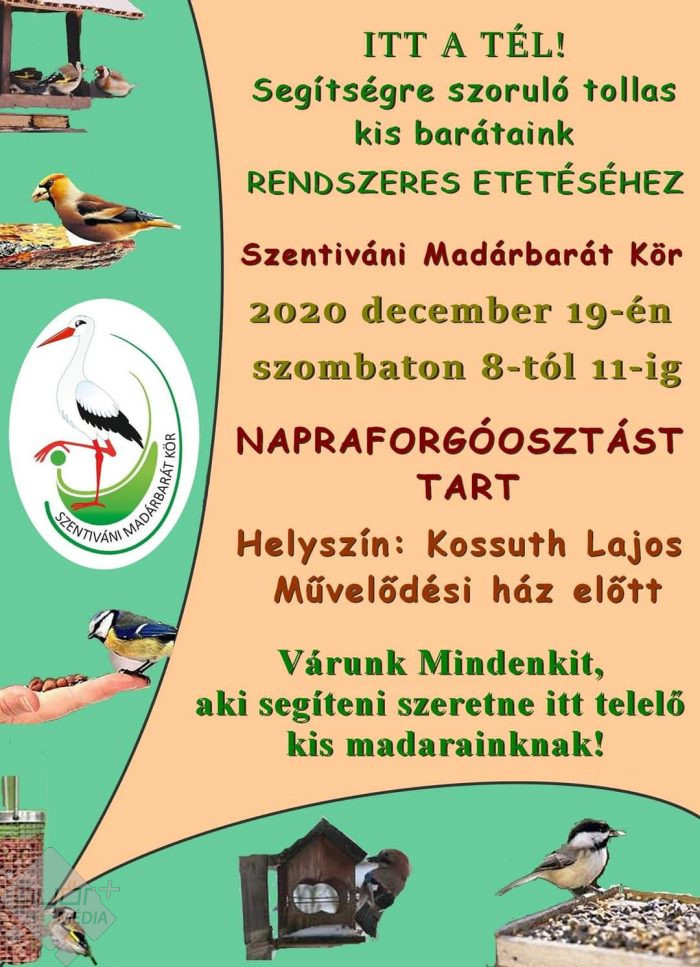 A naptári tél már megkezdődött pár hete, azonban az igazi téli idő beköszöntével a kint élő állatoknak is eljött a leghidegebb évszak. Segítségre szoruló madaraink rendszeres etetéséhez tart napraforgóosztást az idén 15 éves Szentiváni Madárbarát Kör december 19-én, szombaton, reggel 8 órától délelőtt 11-ig, Győrszentivánon, a Kossuh Lajos Művelődési ház előtt (Győr, Déryné út 50).