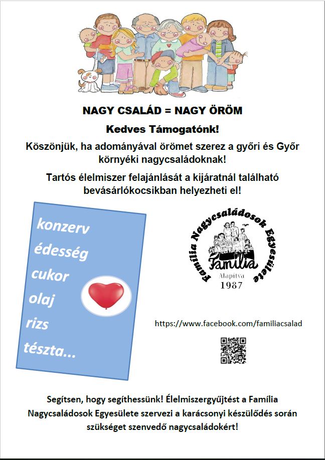 A nagy család nagy örömöt is jelent, ez a szlogenje annak a jótékonysági gyűjtésnek, amelyet november 15-17. között tartanak a győri Metro Áruházban. A szervező a Família Nagycsaládosok Egyesülete, amelynek önkéntesei mindenki szeretettel várnak, aki segíteni tud. A tartós élelmiszereket a kijáratnál található bevásárlókocsiba tehetnek bele.