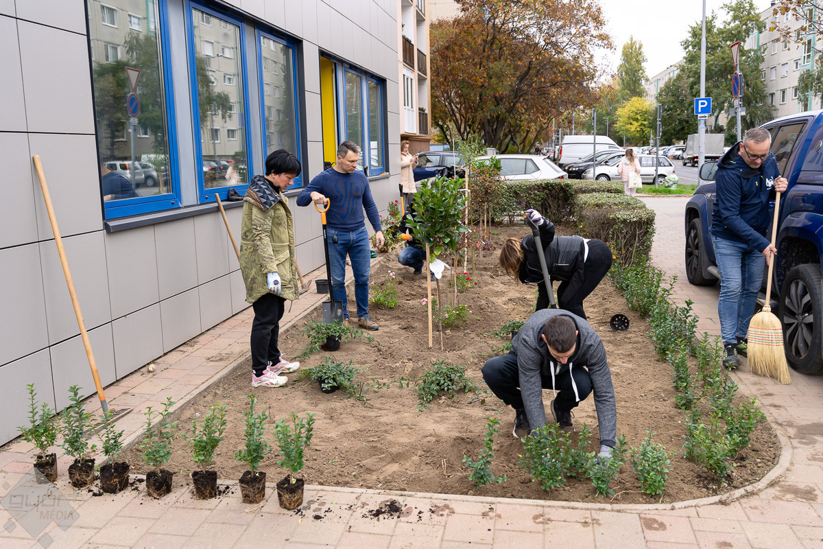 A rendezett talajt tápláltuk szárított szarvasmarha trágyával, majd számos növényt ültettünk el: fagyalt, talajtakaró rózsát, tűzesőt, kakukkfüvet, törzses babérmeggyet, csíkos levelű kecskefűzet és borvörös hólyagvesszőt is. A csodás növényeket a Baráti Díszfaiskolából szereztük be, akiknek szintén köszönjük, hogy akciónk mellé álltak!