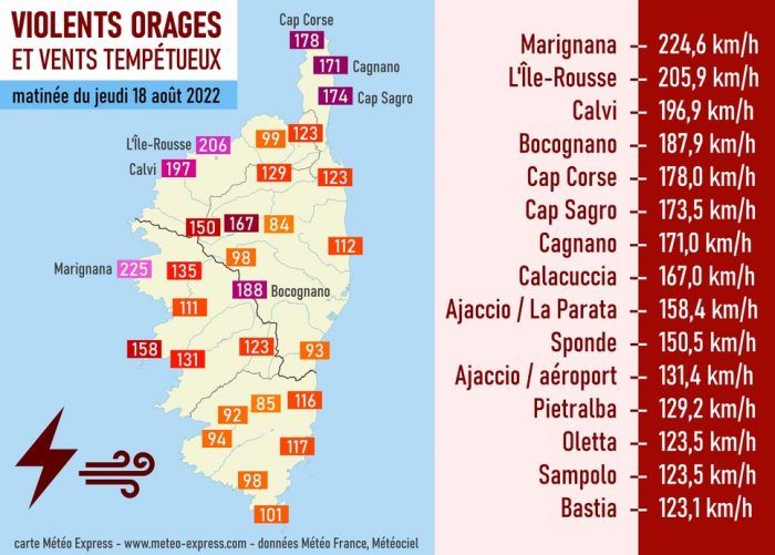 Korzikán pedig több helyen is mértek 200 km/h körüli széllökést, viszont Marignanában 224,6 km/h-s széllökést is regisztráltak. Csak összehasonlításképp, ez a széllökés már megegyezik egy 4-es kategóriájú hurrikánban tomboló szél erősségével.