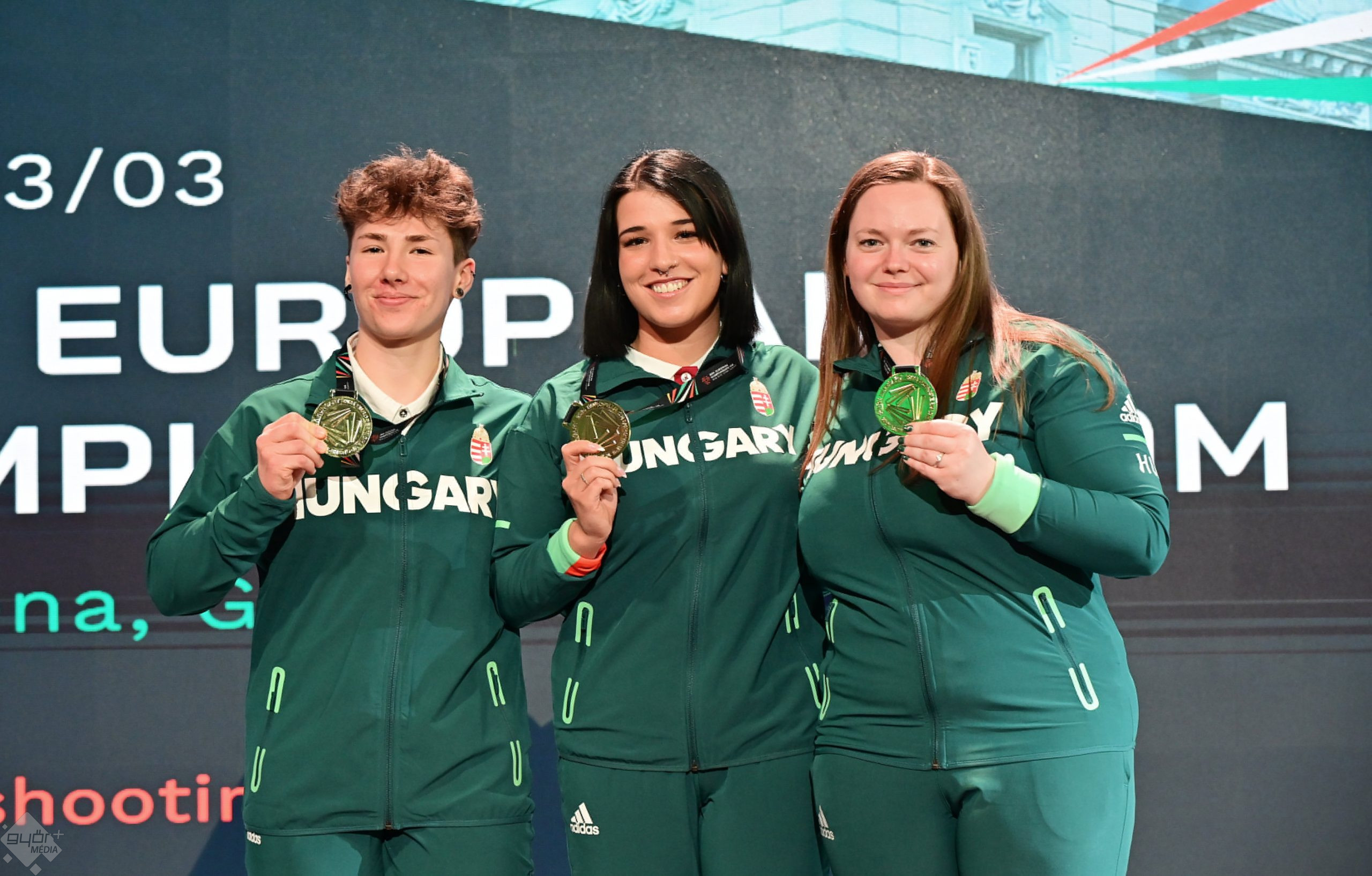 Aranyérmet nyert a Fábián Sára Ráhel, Jákó Miriam, Major Veronika összetételű magyar trió a női pisztolyosok hagyományos csapatversenyében a Győrben zajló légfegyveres Európa-bajnokság csütörtöki versenynapján.