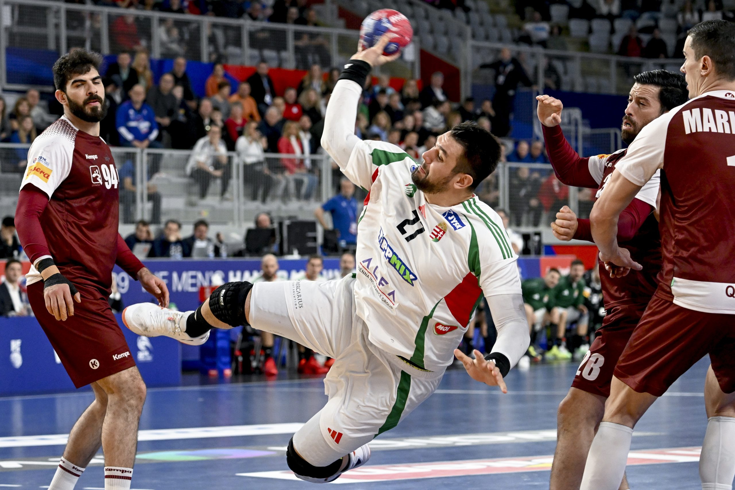 A tavaly Európa-bajnoki ötödik és olimpiai tizedik helyezett magyarok keretéből – Krakovszki Zsolt és Mikler Roland mellett – ezúttal Krakovszki Bence és Ónodi-Jánoskúti Máté maradt ki. Csapatuk annak tudatában lépett pályára, hogy győzelemmel biztosan a negyeddöntőbe jut, döntetlen vagy vereség esetén viszont szurkolnia kell a franciáknak, hogy a 20.30-kor kezdődő találkozón ne kapjon ki Észak-Macedóniától. Négy rontott lövés és három kapott gól után a nyolcadik percben talált be először a magyar együttes (1-3). A 13. percben kettős emberhátrányba kerültek Ligetvári Patrikék, a 18. percben pedig már tíz rontott lövésnél tartottak. Anadin Sulijakovic jól védett a katari kapuban, de komoly bravúrokra nem volt szüksége. Chema Rodríguez szövetségi kapitány 7-3-as hátrányban időt kért, mert bár védekezésben voltak jó megoldások, a támadójáték szinte egyáltalán nem működött. A folytatásban egyre hatékonyabbá váltak a támadások, Imre Bence vezérletével összejött egy 4-1-es sorozat, majd a 28. percben Sipos Adrián egyenlített, a szünetben pedig 12-12 volt az állás.