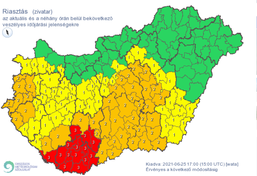 Baranya, Somogy és Tolna megyében a legmagasabb, harmadfokú (piros) riasztásokat is kiadott zivatarveszély miatt az Országos Meteorológiai Szolgálat péntek délután. Ezeken a helyeken rövid időn belül olyan heves zivatarok várhatók, amelyekben a viharos szél és a jégeső is jelentős kockázatot jelent.