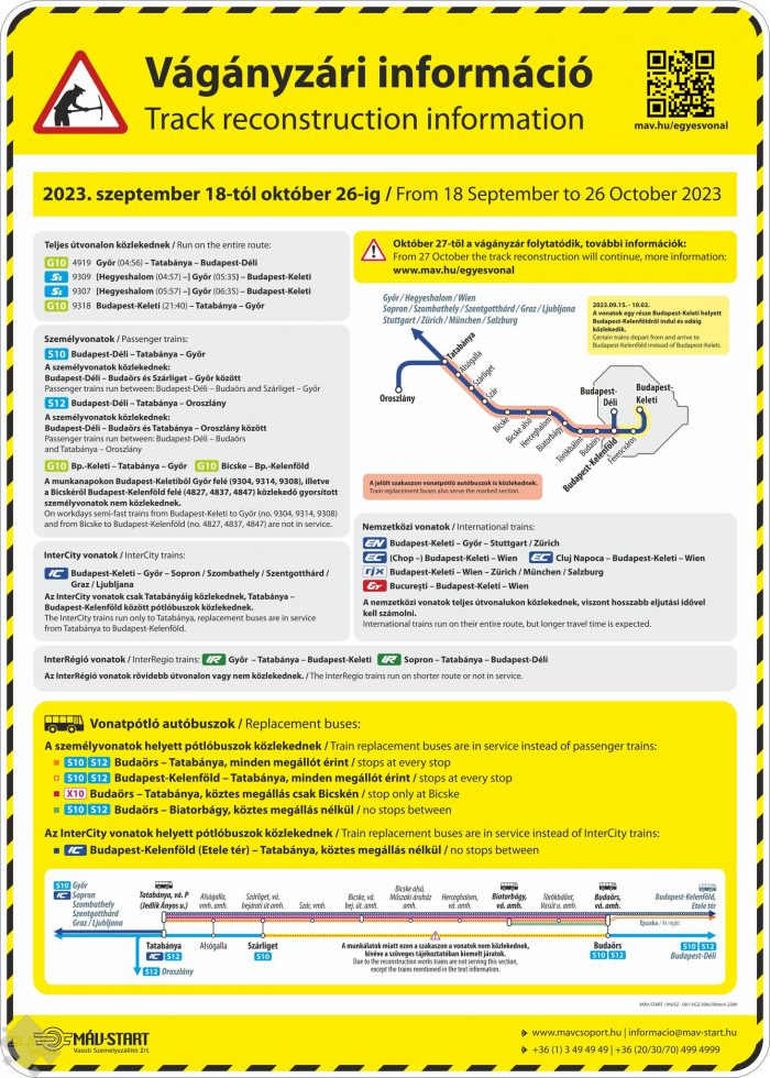 A MÁV az elmúlt napokban folyamatosan telepítette az állomásokra, megállóhelyekre az irányítótáblákat, hirdetményeket, térképeket. A vonatokon, állomásokon a hangosbemondás és a kijelzők is felhívják a figyelmet a változásokra, így például a pótlóbuszok közlekedésére és az átszállásokra. Az első néhány napon a Déli és a Keleti pályaudvaron, valamint a Kelenföld és Tatabánya közötti állomásokon és Győrben a vaúttársaság utastájékoztatási munkatársai segítenek az utasoknak – olvasható a közleményben.