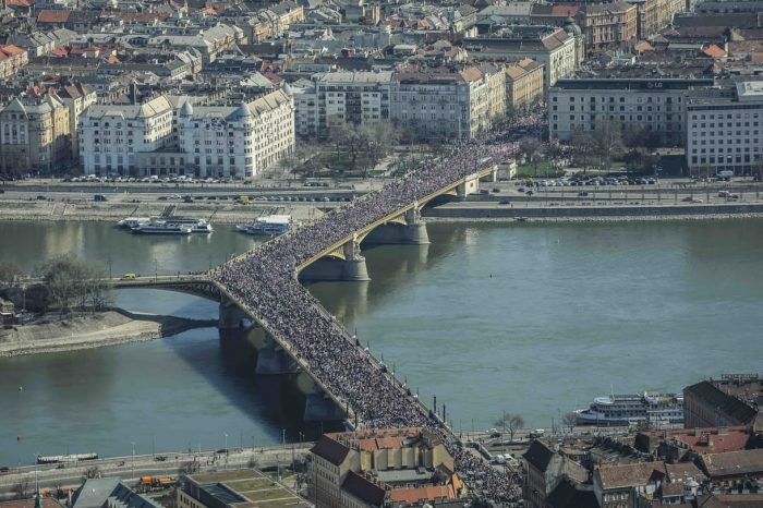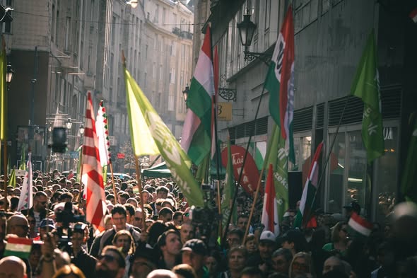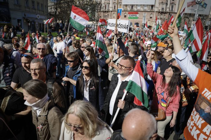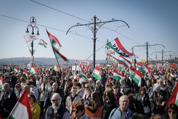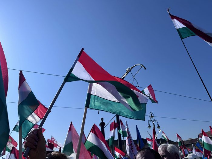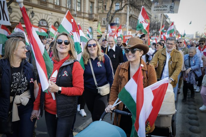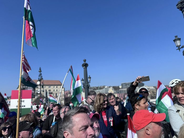 A Békemenetre gyülekező tömeg zászlókkal és nemzeti színű kokárdákkal várja, hogy 11:00 órakor elinduljanak a Parlament előtti térre. Mutatunk néhány hangulatfelvételt :