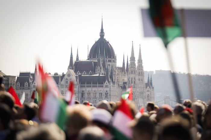 Katonai tiszteletadás mellett felvonják a nemzeti lobogót az Országház előtti Kossuth Lajos téren az 1848-49-es forradalom és szabadságharc 178. évfordulója alkalmából. A lobogót Sulyok Tamás köztársasági elnök jelenlétében, a Himnusz hangjaira a honvédség díszegysége vonta fel az Országház előtt.