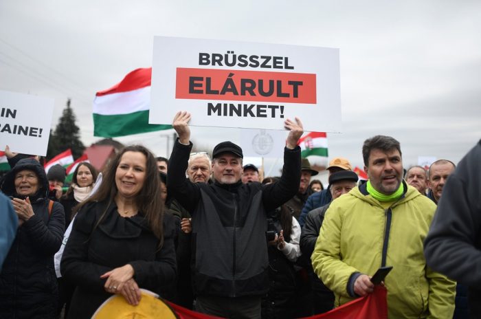 “Az ukrán mezőgazdasági termékeknek eddig is megvolt a piacuk, vigyék oda, ahova eddig vitték, nekünk nem kell egy kiló sem” – hangoztatta Győrffy Balázs. Szavait helyeslő éljenzés és kiabálás fogadta.