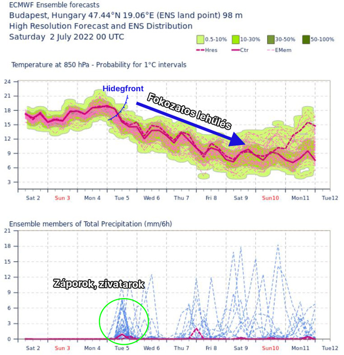 Nem kell azonban sokat várni a tartósabb felfrissülésre, ami a friss előrejelzések szerint kedden veszi kezdetét. Ekkor érkezhet meg ugyanis a következő hidegfront többfelé megerősödő, néhol viharossá fokozódó északnyugati széllel. A front hatására több helyen alakulhatnak ki záporok, zivatarok, melyeket viharos széllökések, néhol jégeső is kísérhet.