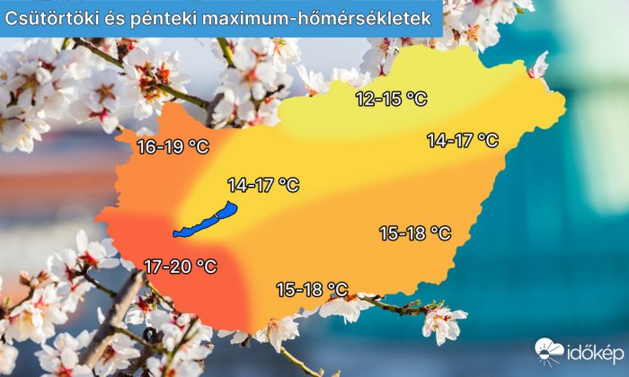 Szerdán még általában 9 és 15 fok közötti maximumokra van kilátás, de csütörtökön és pénteken szinte mindenhol tavaszias hőmérsékletekre számíthatunk. Az Északi-középhegység térségében mérhetjük majd a legalacsonyabb maximumokat, de itt is több fokkal 10 fok felett alakulhatnak a délutáni értékek mindkét napon. Máshol általában 14 és 20 fok közé melegszik a levegő csütörtökön és pénteken is, a legmelegebb délnyugaton lehet, ott 20 fok körüli értékeket mutathatnak a hőmérők.