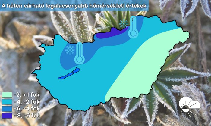 Kivételt a fagy alól az erősebben felhős keleti tájak képezhetnek, ugyanakkor főként a Dunántúlon és az Északi-középhegységben többfelé -3, -5 fokig csökkenhet a hőmérséklet hajnalonként, főként szerdán és csütörtökön. A derültebb, szélvédett északi völgyekben -6, -8 fokos fagy sem zárható ki.