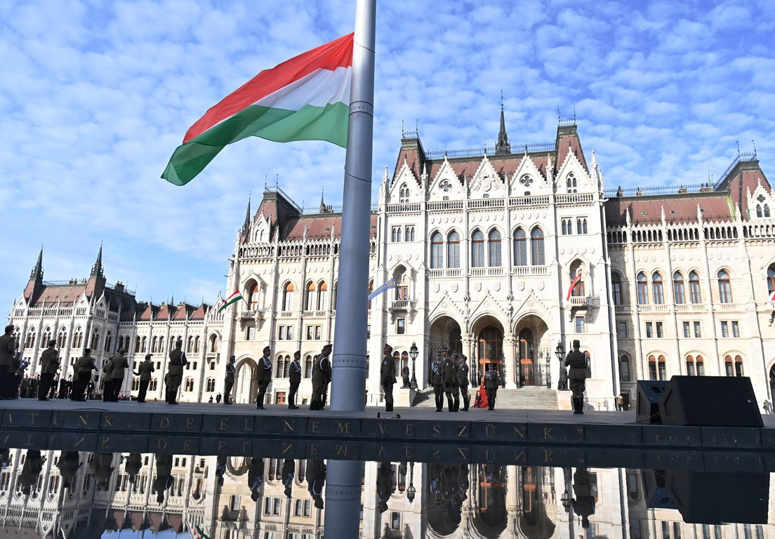 Katonai tiszteletadással, Kövér László, az Országgyűlés elnöke jelenlétében felvonták a nemzeti lobogót az 1956-os forradalom és szabadságharc 67. évfordulóján, hétfő délelőtt Budapesten, az Országház előtti Kossuth Lajos téren.
