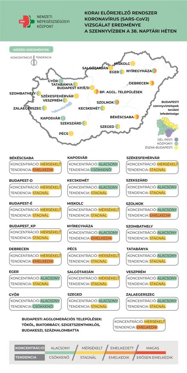 A 38. héten a vizsgált magyarországi városok többségét stagnáló tendencia jellemezte, enyhe emelkedés látható Békéscsabán, Debrecenben, Nyíregyházán, Szolnokon, valamint a Budapest környéki agglomerációs települések – Tököl, Biatorbágy, Szigetszentmiklós, Budakeszi, Százhalombatta – közös mintájában.
