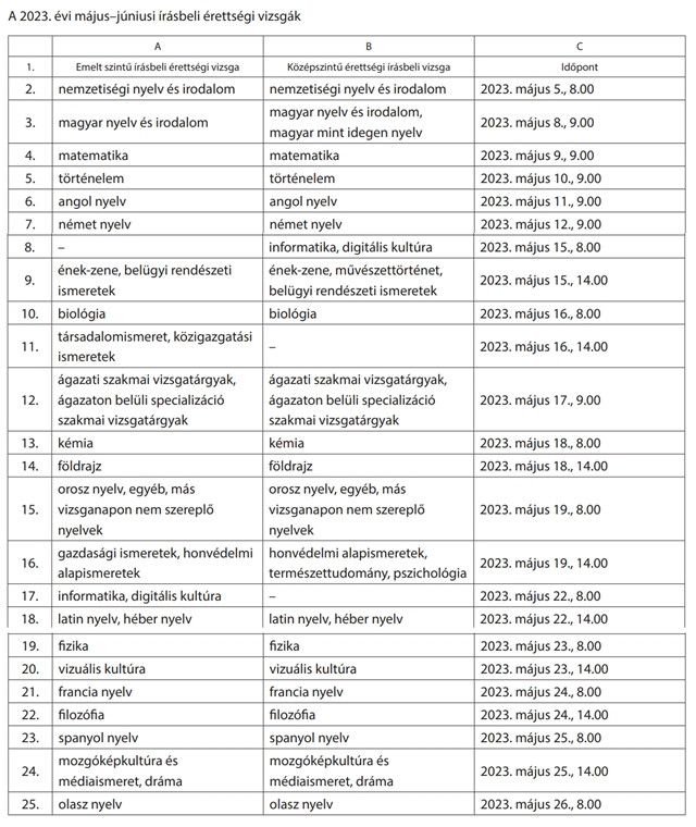 Az első kötelező tantárgy, a magyar nyelv és irodalom írásbelije május 8-án lesz és az előző két évhez hasonlóan nem 8, hanem 9 órakor kezdődik majd.