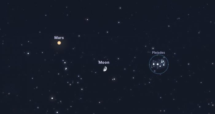 Ha szerencsénk lesz az időjárást illetően, akkor magasan a déli égbolton figyelhetjük meg a hármas együttállást. A Mars és a Fiastyúk között fog elhelyezkedni a 70%-os megvilágítású Hold, mindkettőtől nagyjából 5 fok látszólagos távolságra. Bár a Hold közel lesz a Fiastyúkhoz, és a fénye már valamelyest zavaró lesz a Fiastyúk csillagainak megfigyelésében, de azok még éppen láthatóak lesznek – olvasható az Ng.24.hu oldalán Landy-Gyebnár Mónika cikkében.