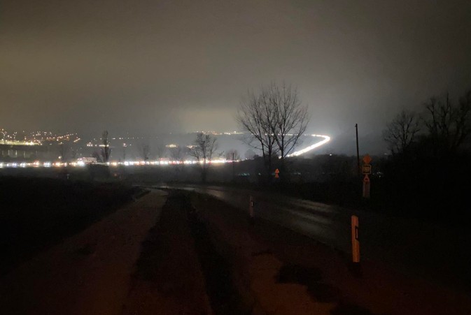 “…ilyen a karácsonyi díszkivilágítás az M1-en Budapest felé, Bicske előtt. A párhuzamos 1-es főút is végig áll Biatorbágyig.”