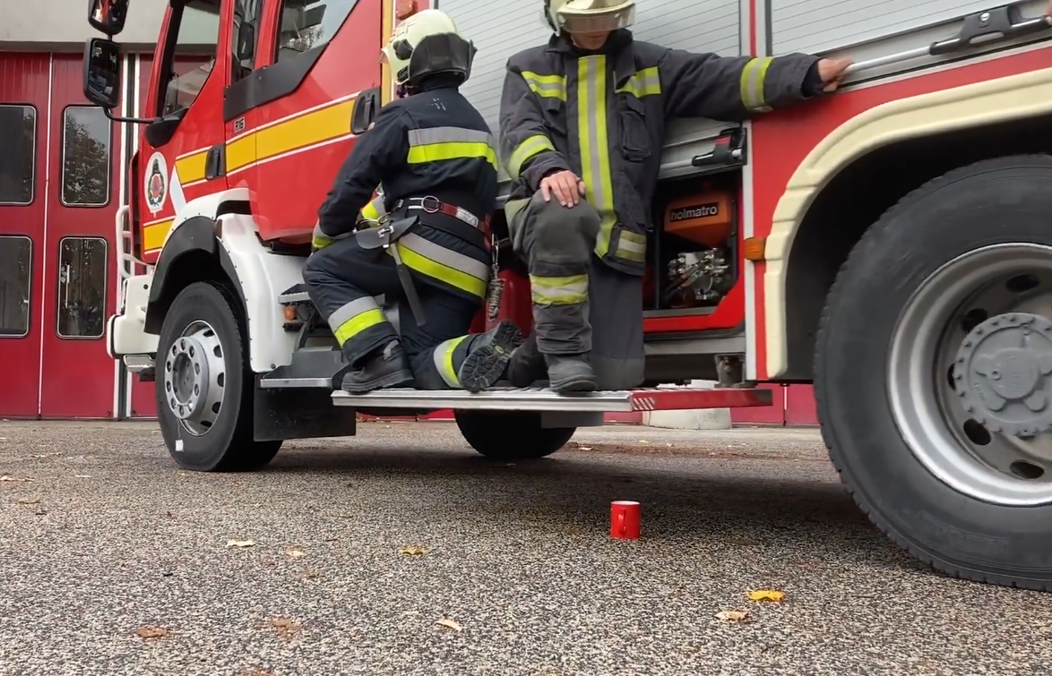 „A gépjárműfecskendő első kerekéhez egy teáskanalat, és arra egy filtert rögzítettek, majd a tűzoltóautó vezetője rátolatott a vízzel teli bögrére, végül a kockacukor is belepottyant a hideg hónapok kedvelt italába. Tűzoltóink szeretik a kihívásokat. A gépjárművezetők hasonló ügyességi feladatokkal a tűzoltószakmai versenyeken is találkoznak, hiszen éles helyzetben bármikor előfordulhat, hogy szűk és kicsi helyen kell manőverezniük a járművekkel.”