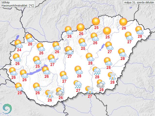 Több helyen kísérhetik élénk széllökések az északi, északkeleti szelet, de zivatarok környezetében átmeneti szélerősödés is lehet. A csúcshőmérséklet döntően 26 és 28 fok között várható. Késő estére 14 és 20 fok közé hűl le a levegő.