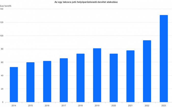 A helyi iparűzésiadó-bevétel 2014-től 2019-ig fokozatosan nőtt, majd 2020-ban, a koronavírus-járvány által előidézett gazdasági nehézségek következtében visszaesett. A 2023-as, jelentősebb emelkedés az iparűzésiadó-maximum ismételten 2%-ban történő megállapítása és a magas infláció mellett annak is volt köszönhető, hogy több településen, ahol korábban nem volt, bevezették ezt az adónemet is.