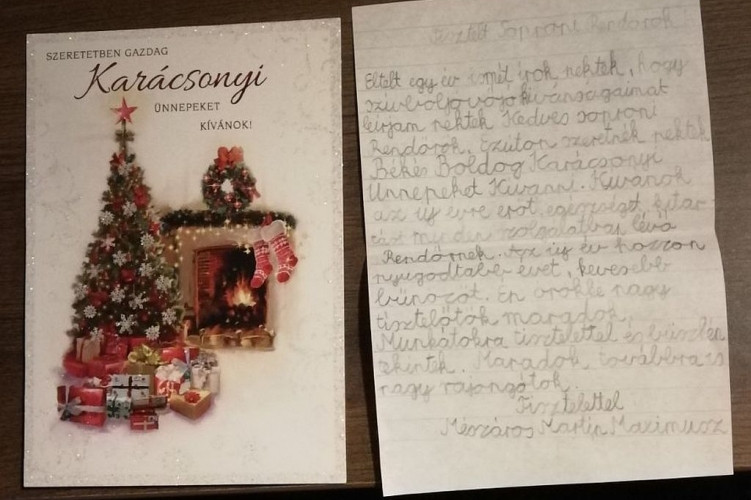 „Eltelt egy év, ismét írok nektek, hogy szívből jövő jókívánságomat leírjam nektek kedves soproni rendőrök. Ezúton szeretnék nektek Békés, Boldog Karácsonyi Ünnepeket kívánni. Kívánok az új évre erőt, egészséget, kitartást minden szolgálatban lévő rendőrnek. Az új év hozzon nyugodtabb évet, kevesebb bűnözőt. Én örökké nagy tisztelőtök maradok. Munkátokra tisztelettel és büszkén tekintek. Maradok továbbra is nagy rajongótok. Tisztelettel: Mészáros Martin Maximus.”