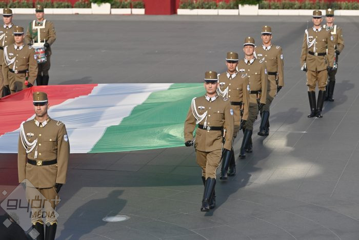 Katonai tiszteletadás mellett, Sulyok Tamás köztársasági elnök jelenlétében vonták fel Magyarország nemzeti lobogóját az augusztus 20-ai állami ünnepen, kedd reggel Budapesten, az Országház előtti Kossuth Lajos téren.