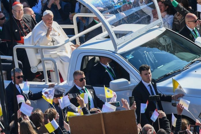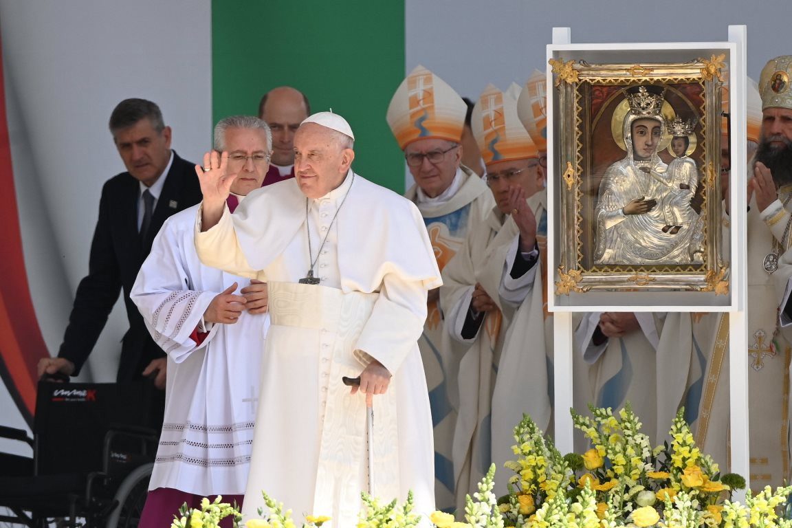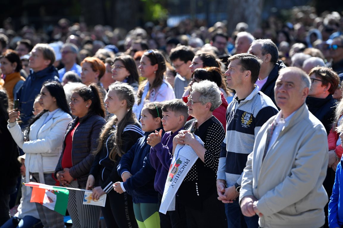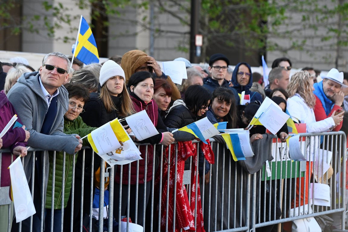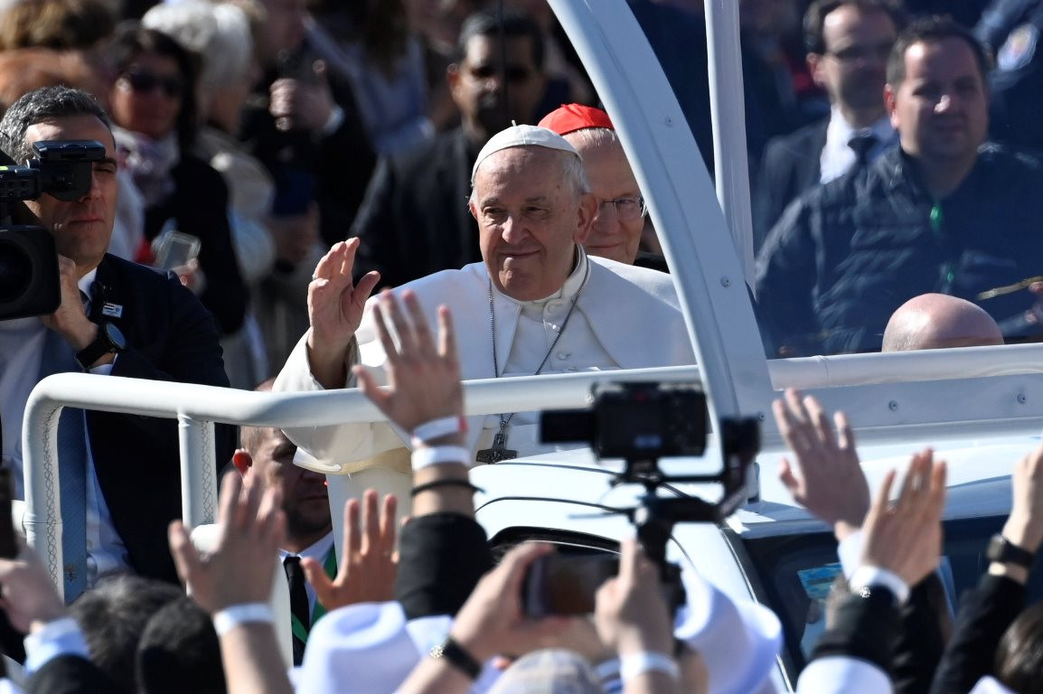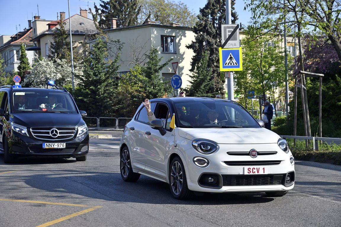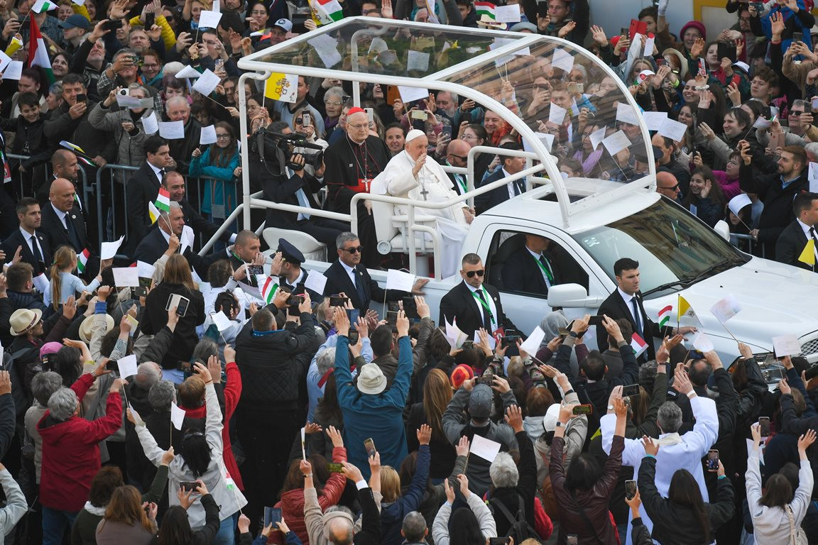 A pápát üdvrivalgással fogadták a hívek. A lassan gördülő kocsiba menet közben odanyújtottak hozzá egy kisgyereket, akinek megsimogatta a fejét.