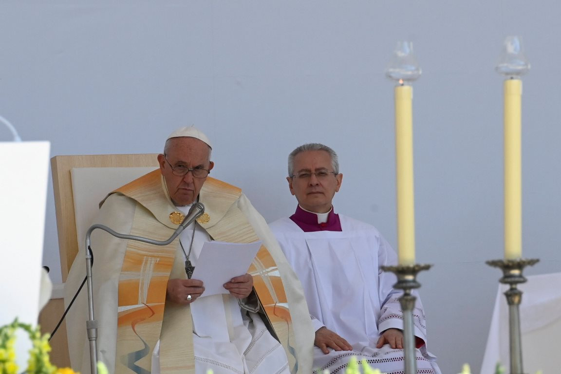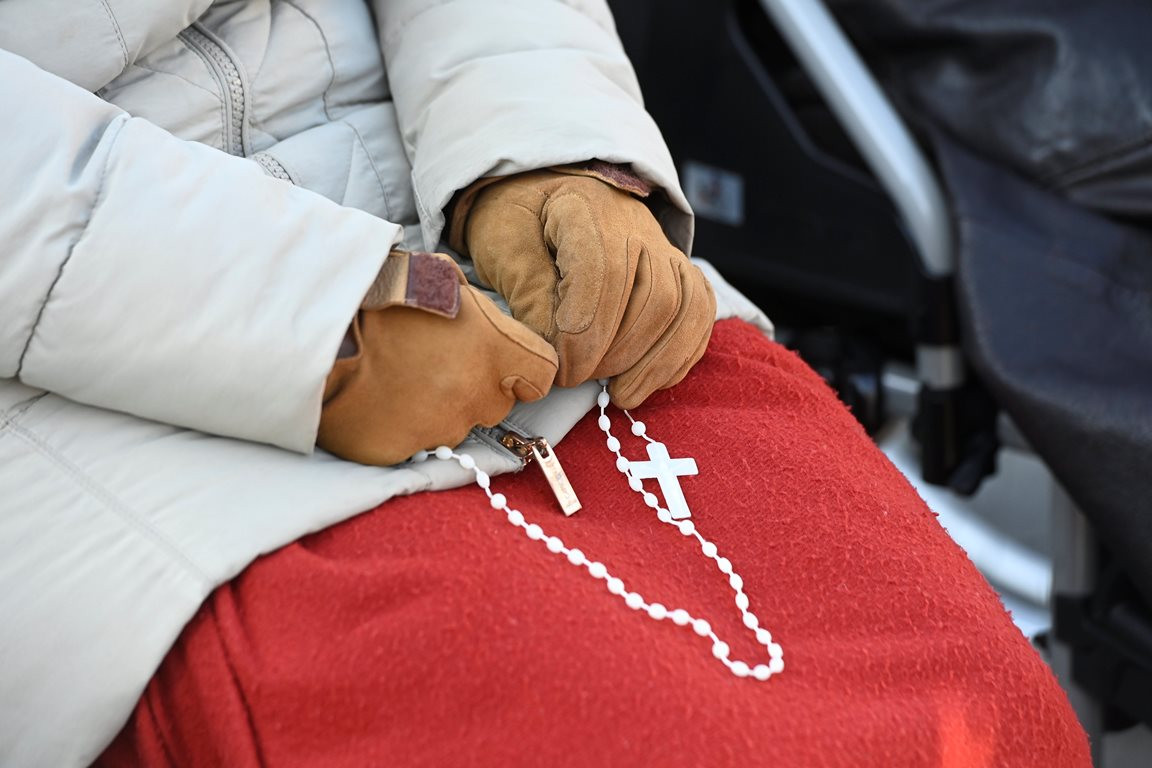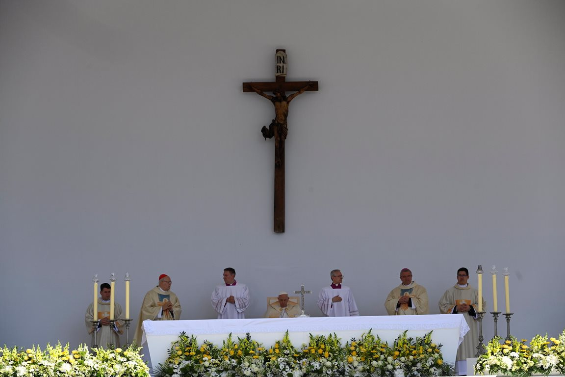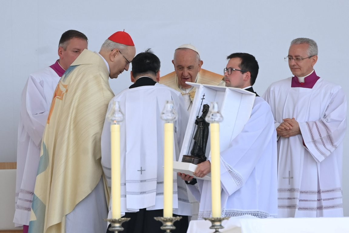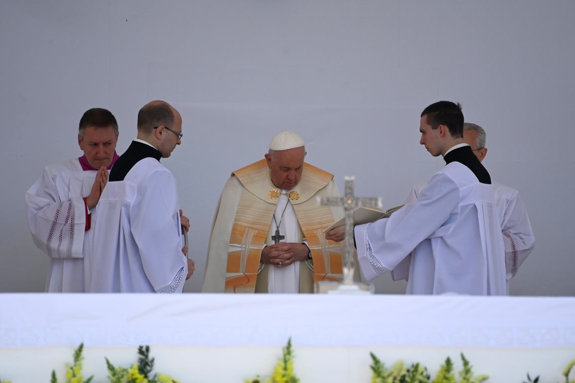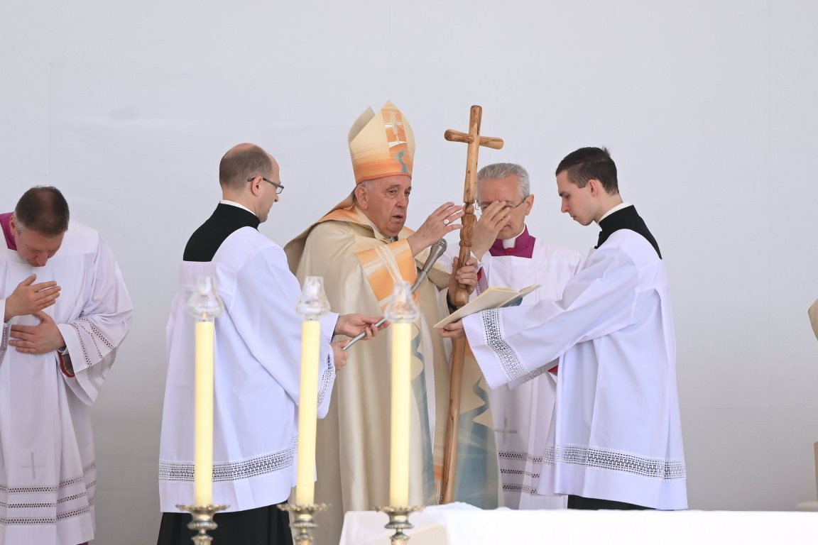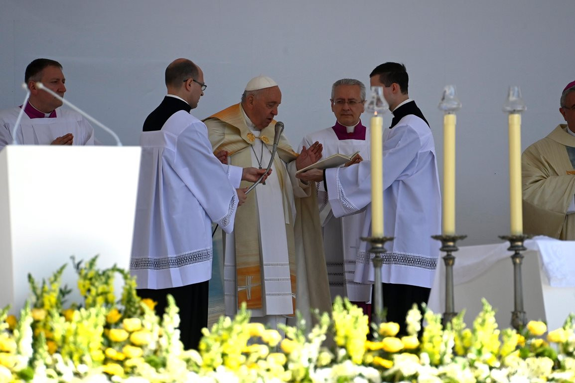 A pápát üdvrivalgással fogadták a hívek. A lassan gördülő kocsiba menet közben odanyújtottak hozzá egy kisgyereket, akinek megsimogatta a fejét.