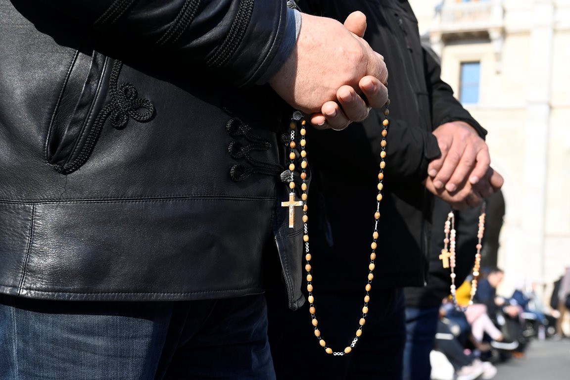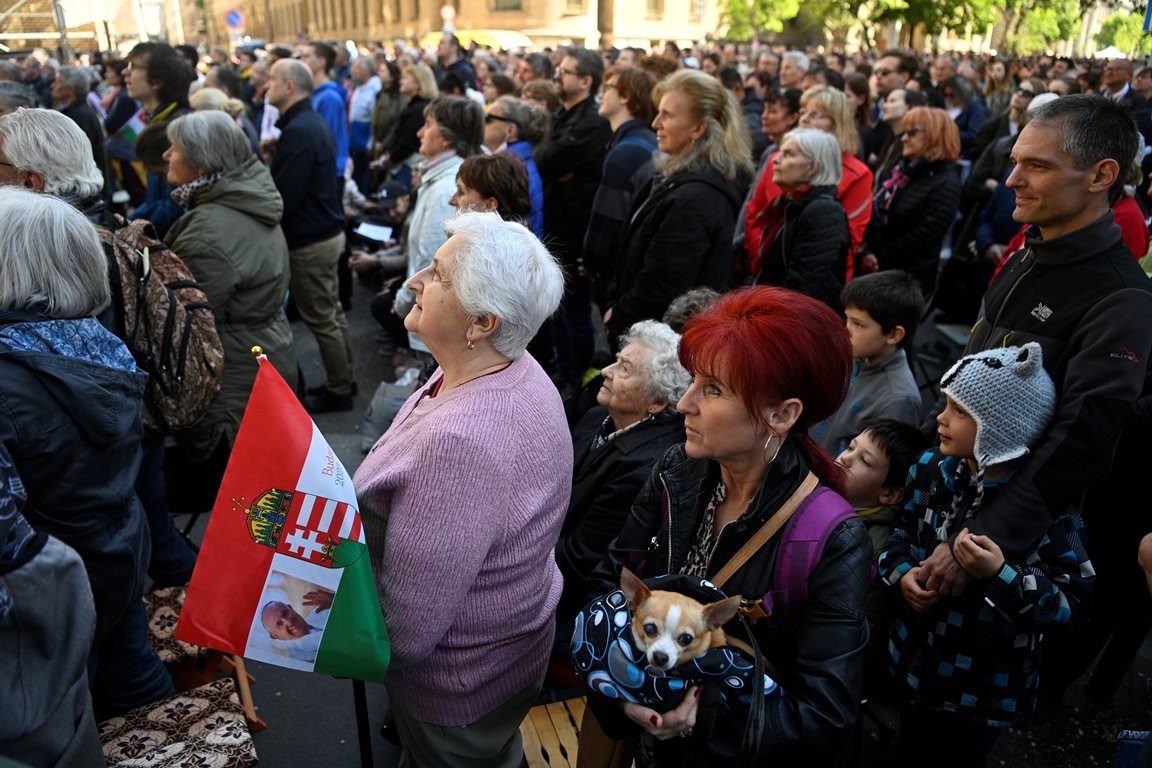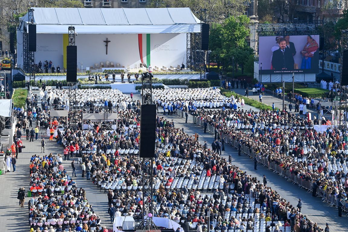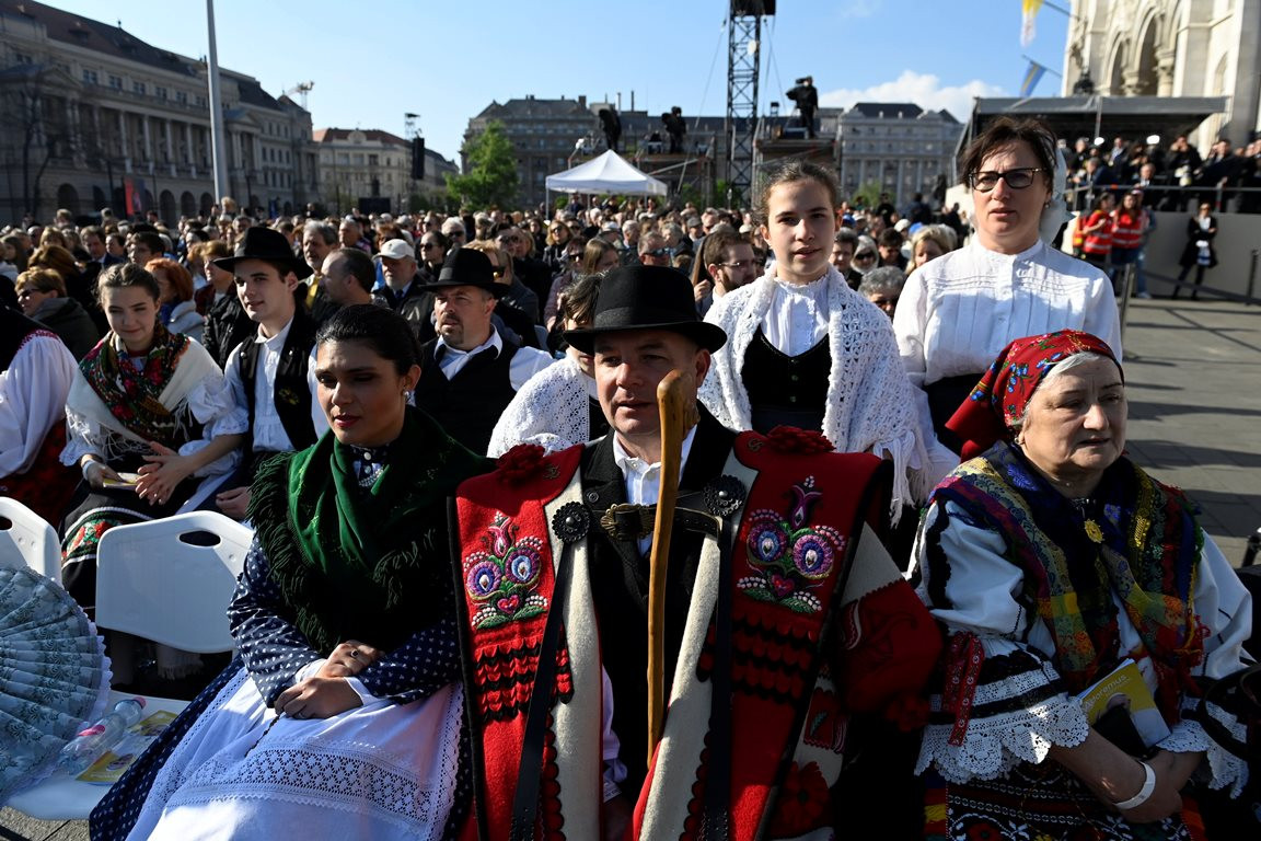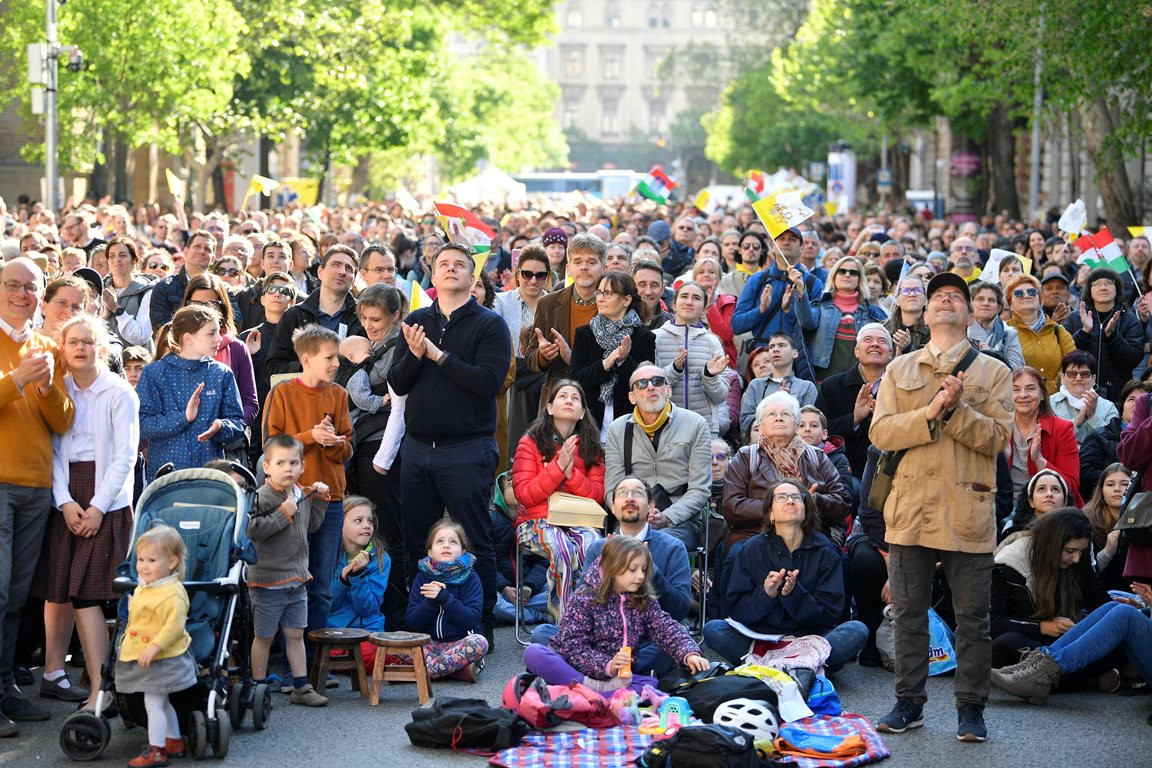 Többen a tömegben magyar, illetve vatikáni zászlót lengetnek. A zászlókról, transzparensekről kiderül, hogy a magyar városokon túl szinte az összes határon túli országból érkeztek résztvevők.