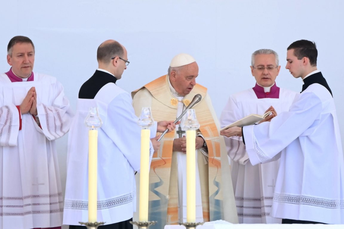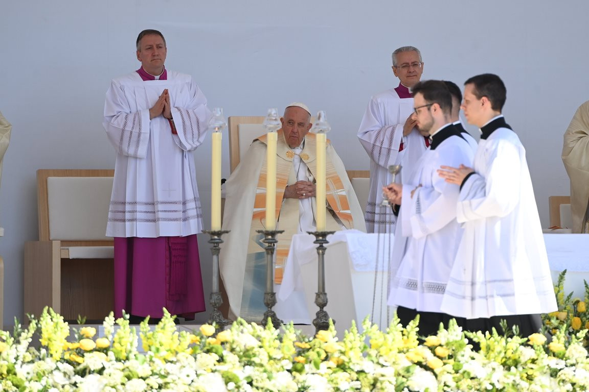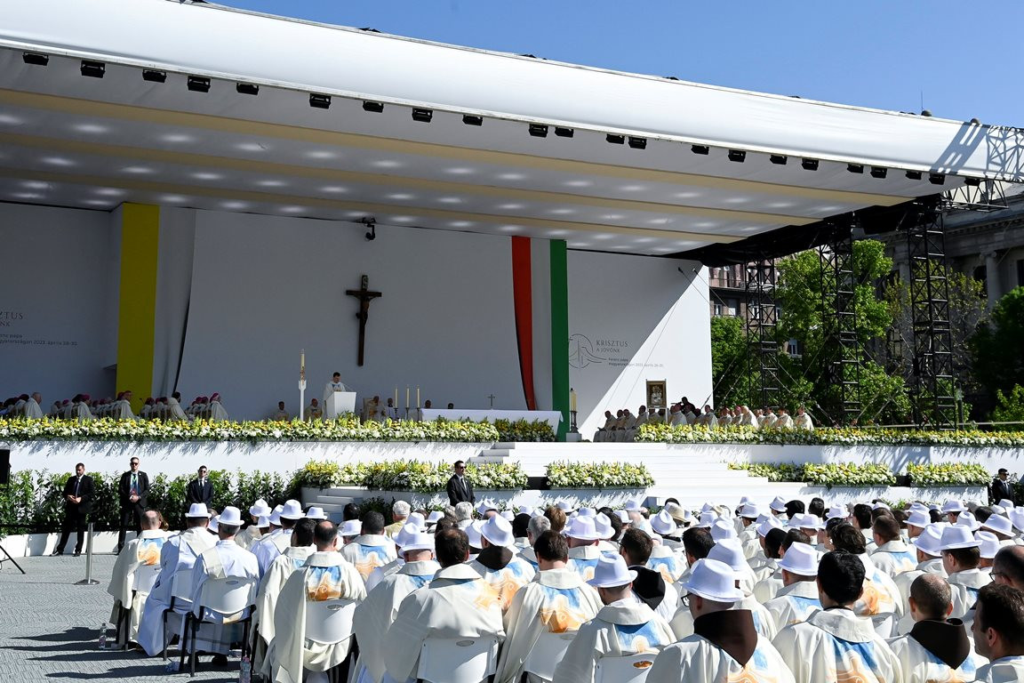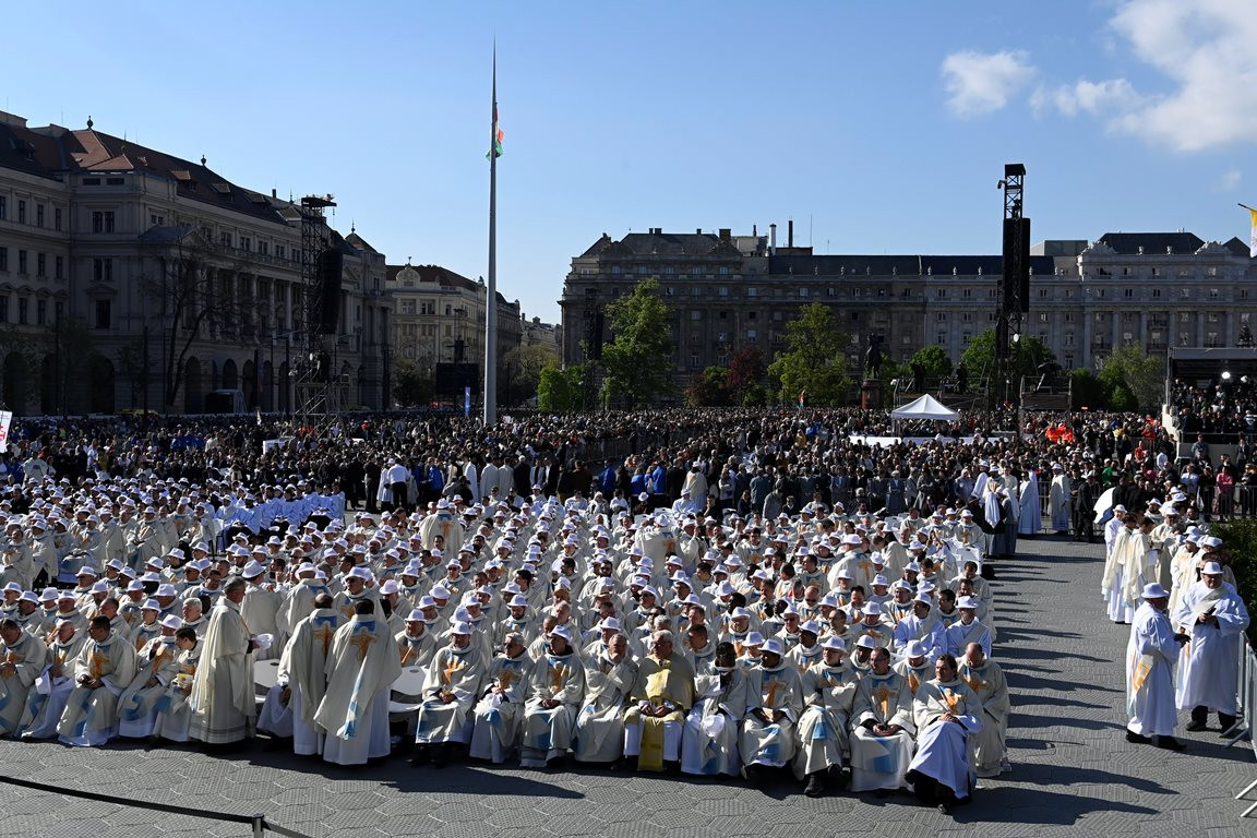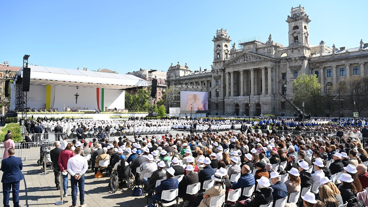Megtelt a Kossuth Lajos tér Ferenc pápa vasárnap délelőtt tartandó szentmiséje előtt. A katolikus egyházfő nyitott fehér autóban érkezett kilenc óra körül a térre, mögötte Erdő Péter bíboros, esztergom-budapesti érsek volt látható - jelentették a helyszínről az MTI tudósítói.