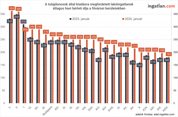 A friss, január első hetére jellemző bérleti díjak alapján Budapesten a kiadó lakóingatlanok bérleti díjának középértéke 260 ezer forint. A legdrágább kerület az V. kerület 363 ezer forintos mediánnal, míg a legolcsóbb a XXIII. kerület 183 ezer forinttal. A kiemelt kerületek közül a VIII. és a IX. kerületben egyaránt 250 ezer forint az albérletárak középértéke, a XI. kerületben 270 ezer forint, a XIII. kerületben pedig 260 ezer forint.