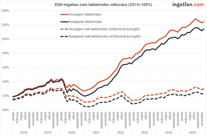Változott a helyzet a magyarországi albérletpiacon 2025 végén. Decemberben országosan 0,6 százalékkal, Budapesten pedig 1 százalékkal emelkedtek a bérleti díjak az előző hónaphoz képest. Ezzel véget ért a korábbi, három hónapon át tartó árcsökkenés, ugyanakkor éves összevetésben tovább mérséklődött az albérletdrágulás üteme: országosan már csak 5,4 százalékkal, Budapesten pedig 5,6 százalékkal voltak magasabbak a bérleti díjak, mint egy évvel korábban – áll a KSH-ingatlan.com lakbérindexéhez fűzött elemzésből, amely ismerteti az átlagos bérleti díjak januári szintjét és a kínálat változását is.