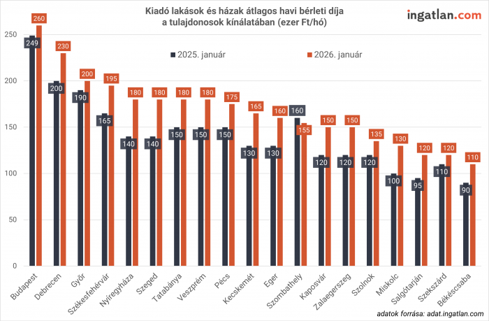 A vármegyeszékhelyek közül Debrecen 230 ezer forintos medián lakbérrel kezdte az évet, míg Győrben ugyanez az összeg 200 ezer forint, Szegeden és Veszprémben pedig egyaránt 180 ezer forint. Pécsen 175 ezer forintért, Kecskeméten 165 ezer forintért, Egerben 160 ezer forintért, Miskolcon pedig 130 ezer forintért várják a bérlőket a kiadó lakások és házak átlagos bérleti díja alapján.