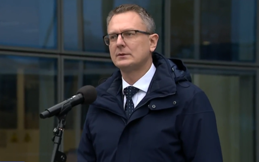 Rétvári Bence a Belügyminisztérium parlamenti államtitkára, miniszterhelyettes és Gál Kristóf ezredes, az ORFK Kommunikációs Szolgálatának vezetője tartott sajtótájékoztatót a Teve utcai rendőrségi központ előtt az országszerte több mint 240 iskolát érintő bombariadóval kapcsolatban.