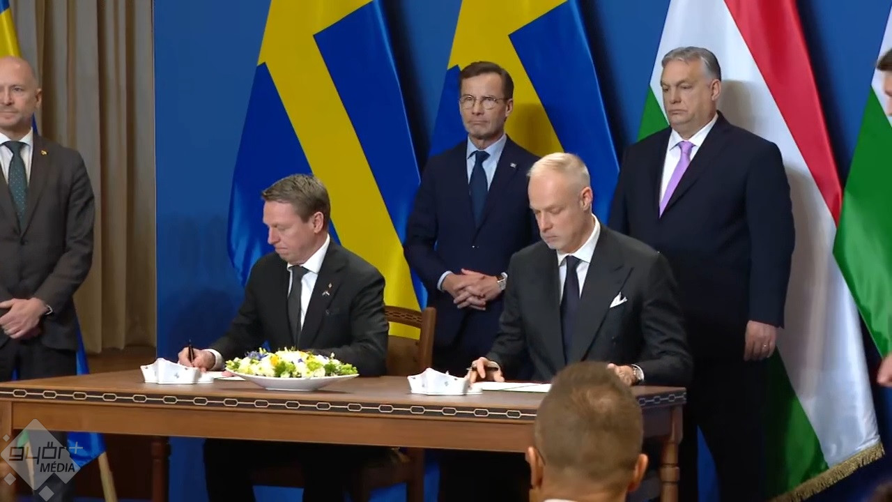 Orbán Viktor arról is beszélt: hétfőn a parlament elfogadja Svédország NATO-tagságát. A két ország miniszterelnökének közös sajtótájékoztatója előtt Szalay-Bobrovniczky Kristóf honvédelmi miniszter és svéd kollégája írta alá a hadiipari megállapodásokat.