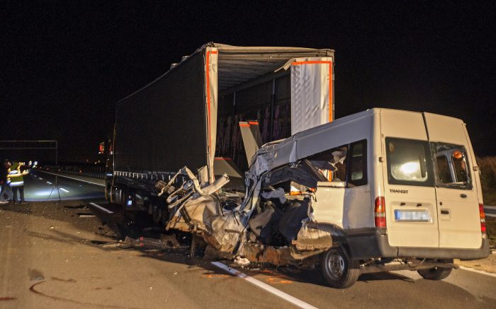 Az M4 autóút 89-es kilométerszelvényében lévő csomópontnál pénteken egy kistehergépkocsi hátulról egy kamionnak ütközött. A furgonban öt ember vesztette életét.