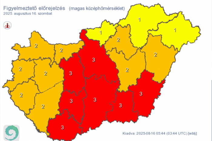 Szombaton tetőzik a kánikula, a csúcsértékek 34 és 40 fok között alakulnak. A HungaroMet emiatt a legmagasabb, azaz a piros figyelmeztetést adta ki szombatra Békés, Csongrád-Csanád, Bács-Kiskun, Pest, Fejér, Tolna és Baranya vármegyére, valamint Budapestre is. Ez azt jelenti, hogy a napi középhőmérséklet 29 fok fölött alakulhat.