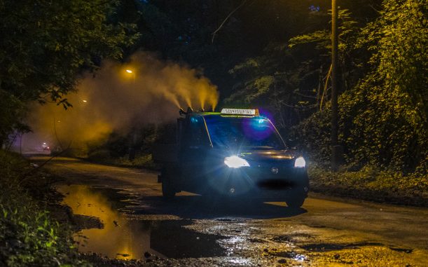 A kifejlett szúnyogok ellen platós gépjárművekre rögzített permetező berendezésekkel avatkoznak be a települések belterületein. Az alkalmazott készítményt kis dózisban juttatják ki, ebben a mennyiségben emberekre, háziállatokra és növényekre nincs káros hatással. A kezeléseket napnyugta után hajtják végre, így az irtószerrel a nappal aktív rovarok nem találkoznak.