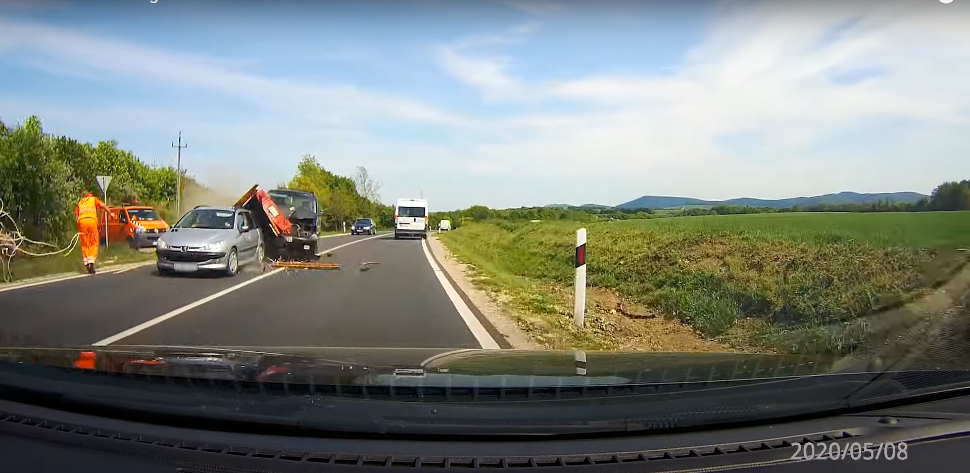 Veszprém megyében történt a baleset, a felvétellel a Magyar Közút Nonprofit Zrt. szeretné felhívni a figyelmet az útmenti munkálatokra.