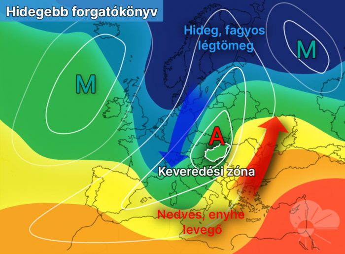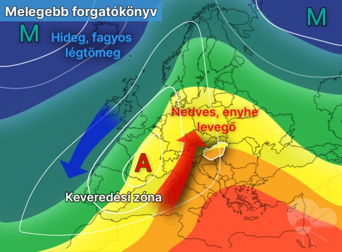 Ha ez a forgatókönyv valósul meg, az említett keveredési zóna inkább tőlünk nyugatra alakulhat ki, hozzánk enyhe, kora tavaszias idő jöhet.