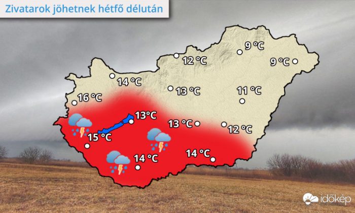 A front mentén zivatarok is kipattanhatnak, nagyobb eséllyel a Bakonyban és az ország déli felén, de máshol sem zárható ki, hogy megdörrenjen az ég. A zivatarokhoz helyenként jégeső is társulhat. Késő estére a front elhagyja a déli országrészt is.