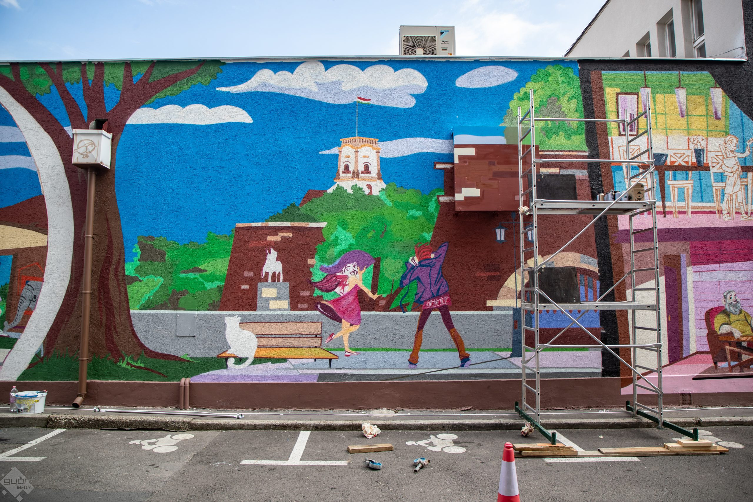 Szépen alakul a belvárosban a sajtóban múlt héten beharangozott óriás graffiti. Ahogy arról a Győr+ Média szokás szerint elsőként számolt be, az egyik Bajcsy-Zsilinszky utcai üzlet hatalmas tűzfalára egy nagy, színes festmény kerül, ami a győri polgári élet részleteit ábrázolja. A faldíszítés a polgármester ötlete volt, megvalósítója pedig a Hősök zenekar egyik tagja, Ozsváth Gergely, vagyis Mentha, aki, ha csak nem esik az eső, folyamatosan dolgozik az Arrabona udvarban. A teljesen egyedi óriás graffiti a tervek szerint a jövő héten el is készül.