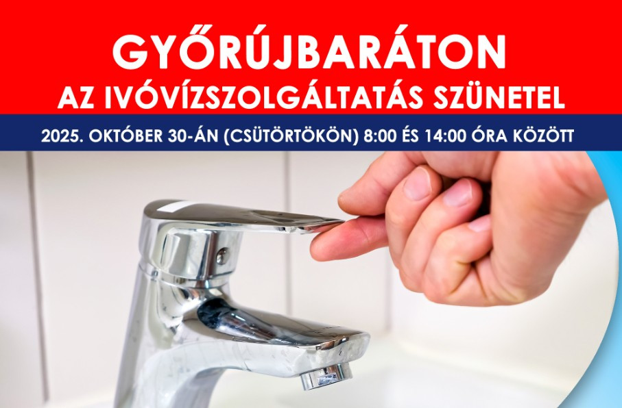A Pannon-Víz Zrt. tájékoztatása szerint október 30-án, csütörtökön ivóvízhálózat rekonstrukciós munkákat végeznek Győrújbaráton, így több utcában nem lesz víz.