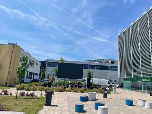 Győr+ 2022.06.03. Óriáskivetítőn nézhetjük a Final Fourt Elkészült az óriás kivetítő a Sieger Sport & Gastro Bar előtti téren.