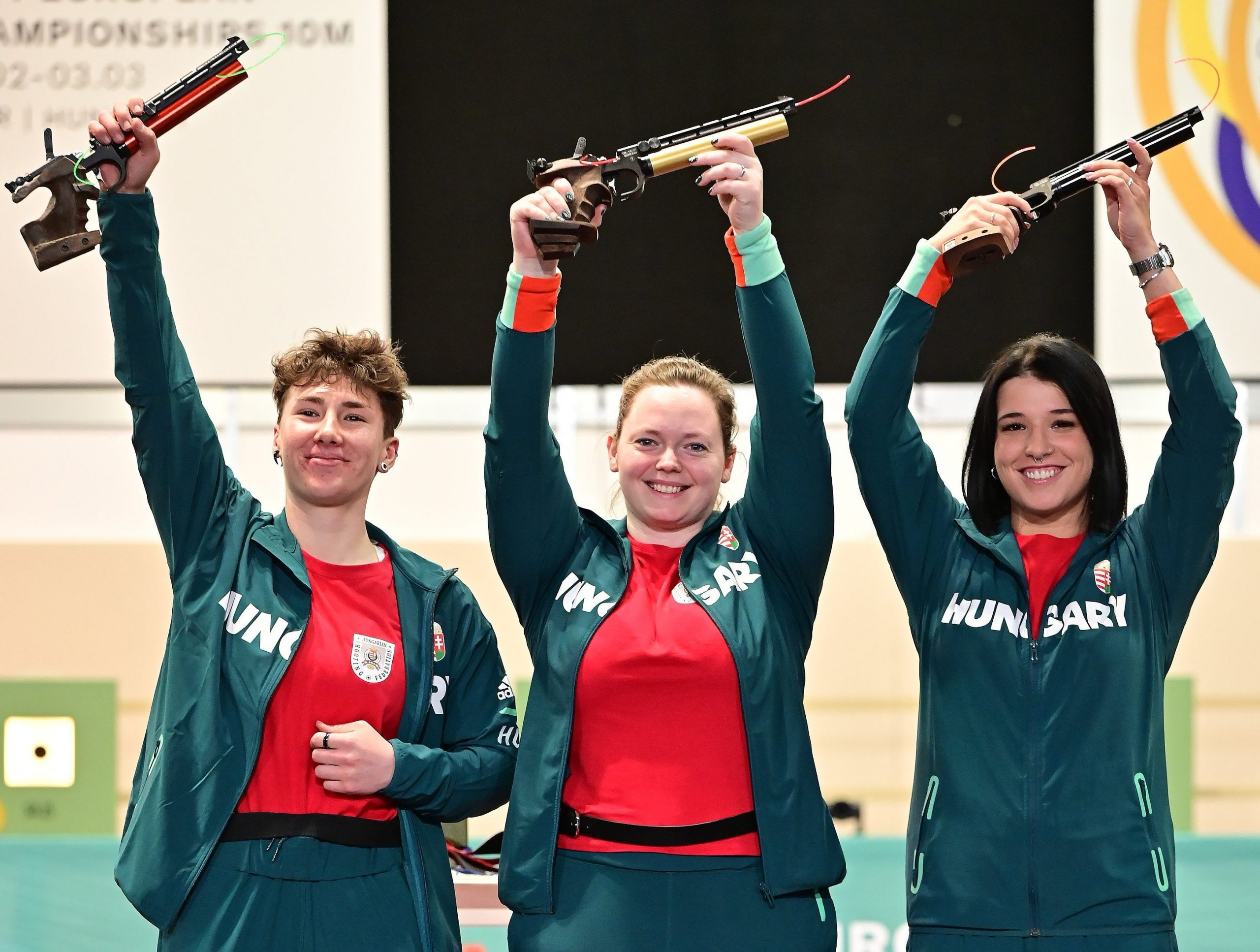 Aranyérmet nyert a Fábián Sára Ráhel, Jákó Miriam, Major Veronika összetételű magyar trió a női pisztolyosok hagyományos csapatversenyében a Győrben zajló légfegyveres Európa-bajnokság csütörtöki versenynapján.