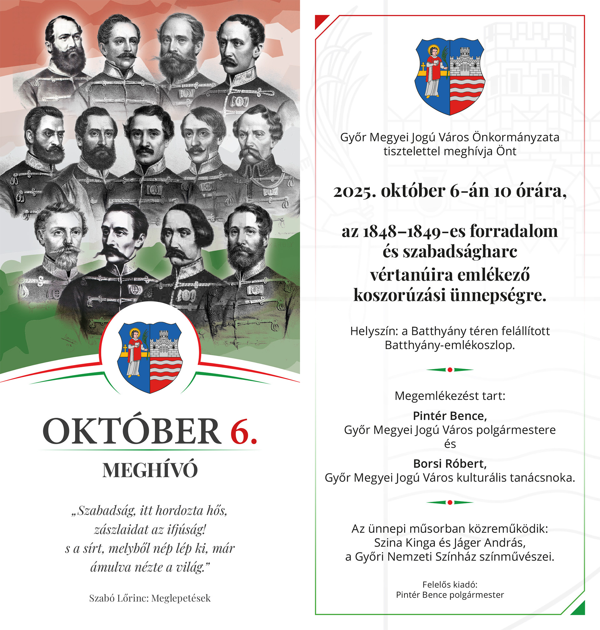 Megemlékezést tartottak október 6-án, pénteken az aradi vértanúk emlékére a Batthyány téren. A hagyományos ünnepségen Szeles Szabolcs, Győr alpolgármestere mondott beszédet, és számos győri szervezet képviselője tette tiszteletét a Batthyány-emlékműnél.
